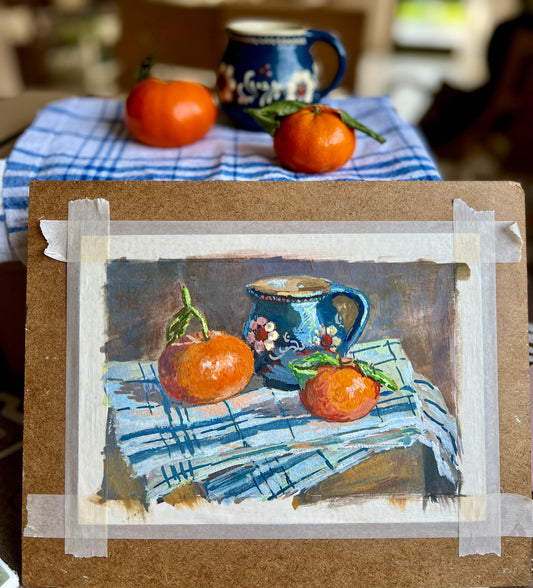 Gouache Painting - Grapefruit Slices with a ceramic jug