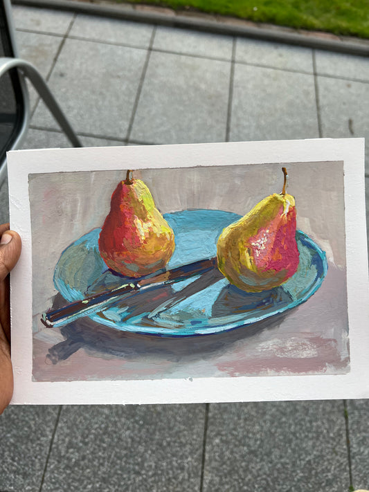 Pears on blue plate - Gouache painting