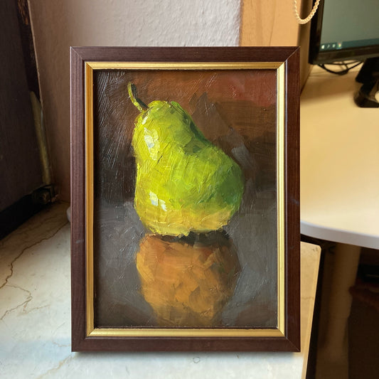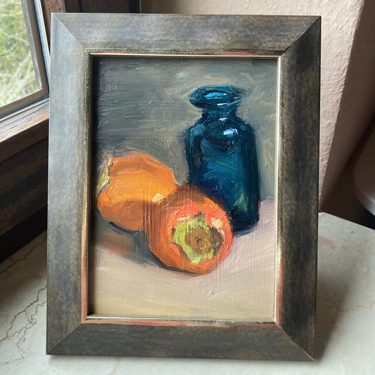 Pears with a blue glass - Small oil painting, 8 by 8 inches
