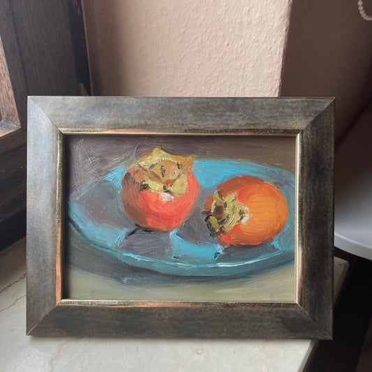Lemons with a blue glass - Small oil painting, 8 by 8 inches
