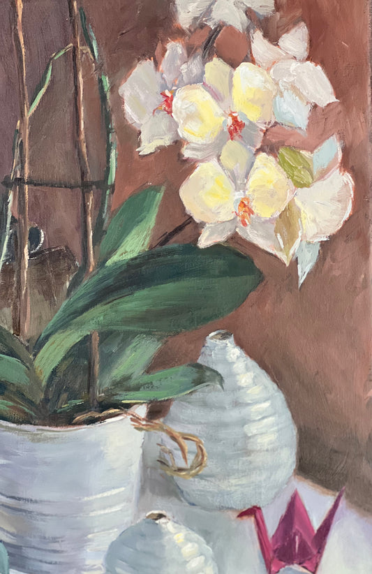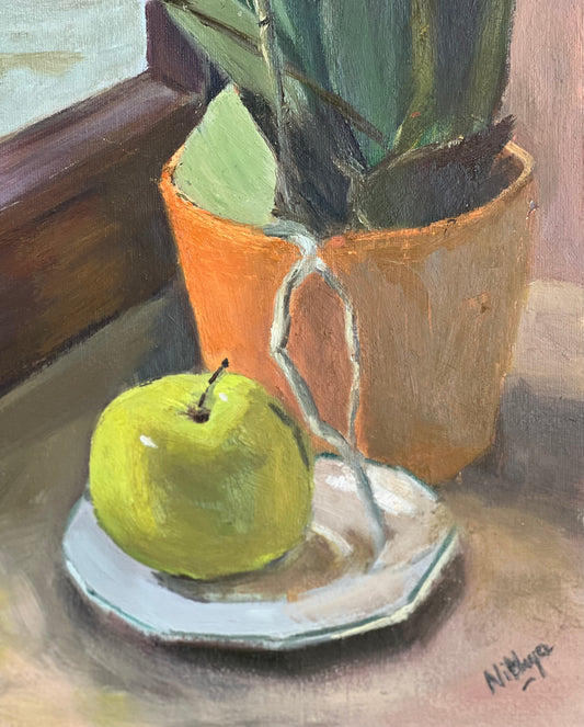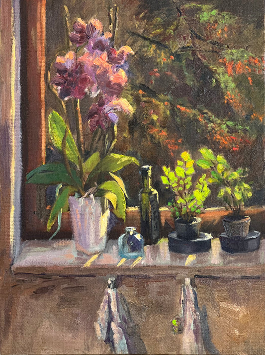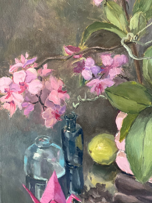 Still Life Oil Painting - Orchids and Apple on a windowsill