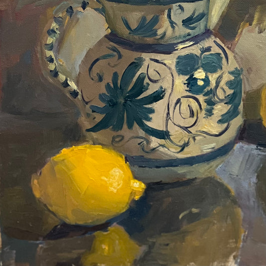 Backlit Lemons and Blue Jars in the kitchen - Still Life Oil Painting