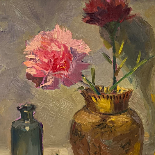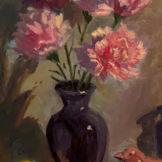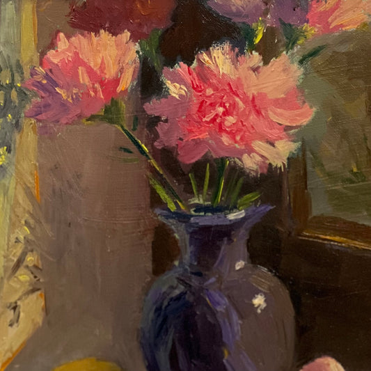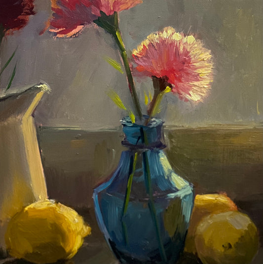 Lemons in a Blue Bowl and flowers - Still Life Oil Painting
